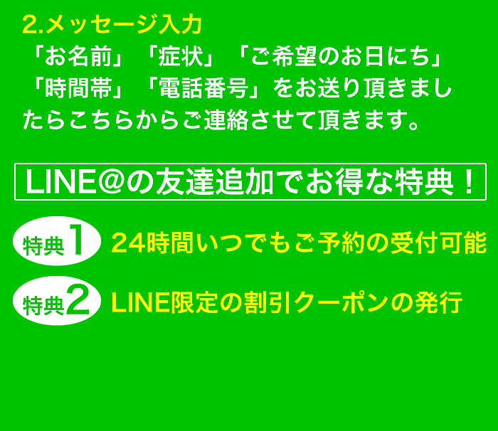 そのため、ご希望の時間帯を事前にお電話にて予約していただいた後に来院していただくので、あなたをお待たせすることなくすぐに施術を開始することができます。